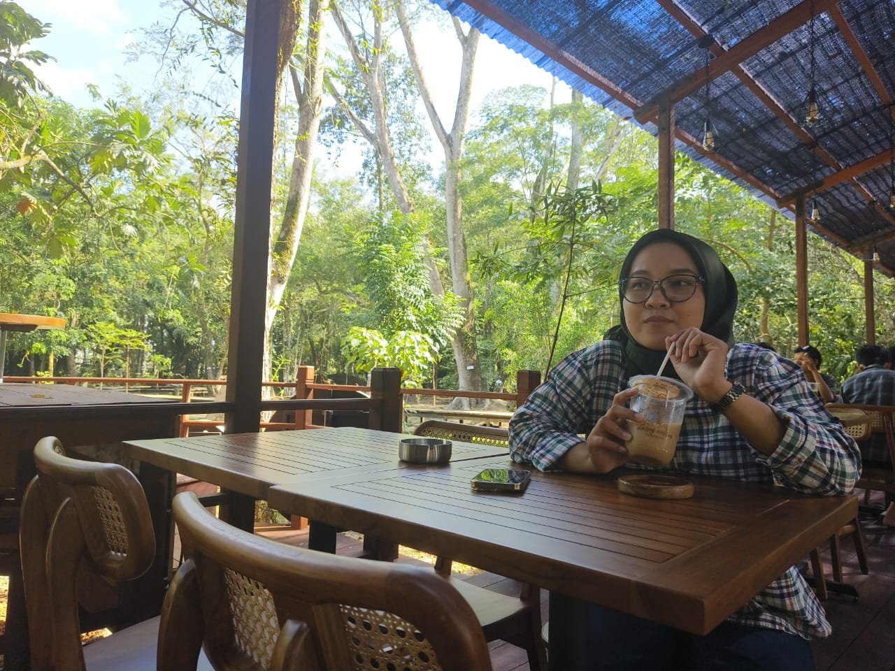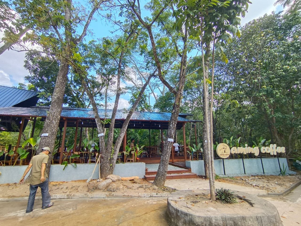 Aming Coffee di lokasi ini dikelilingi pepohonan yang rindang layaknya berada di tengah hutan.