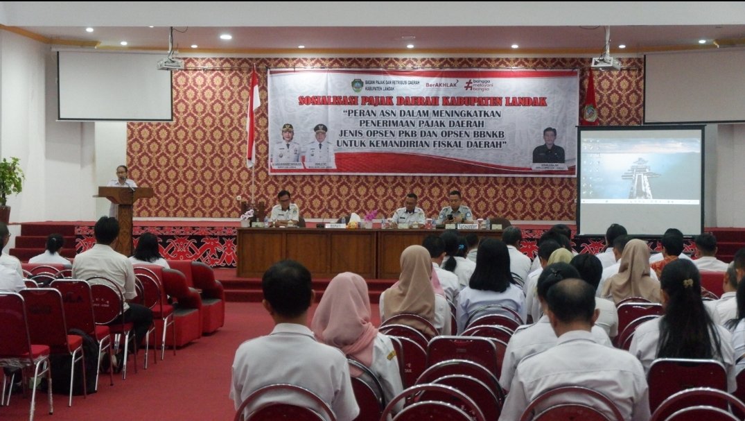 LANDAK – Badan Pajak dan Retribusi Daerah Kabupaten Landak menyosialisasikan penerimaan pajak daerah jenis Opsen PKB dan Opsen BBNKB kepada para ASN Kabupaten Landak di Aula Besar Kantor Bupati Landak. Rabu, 21 Mei 2025.
