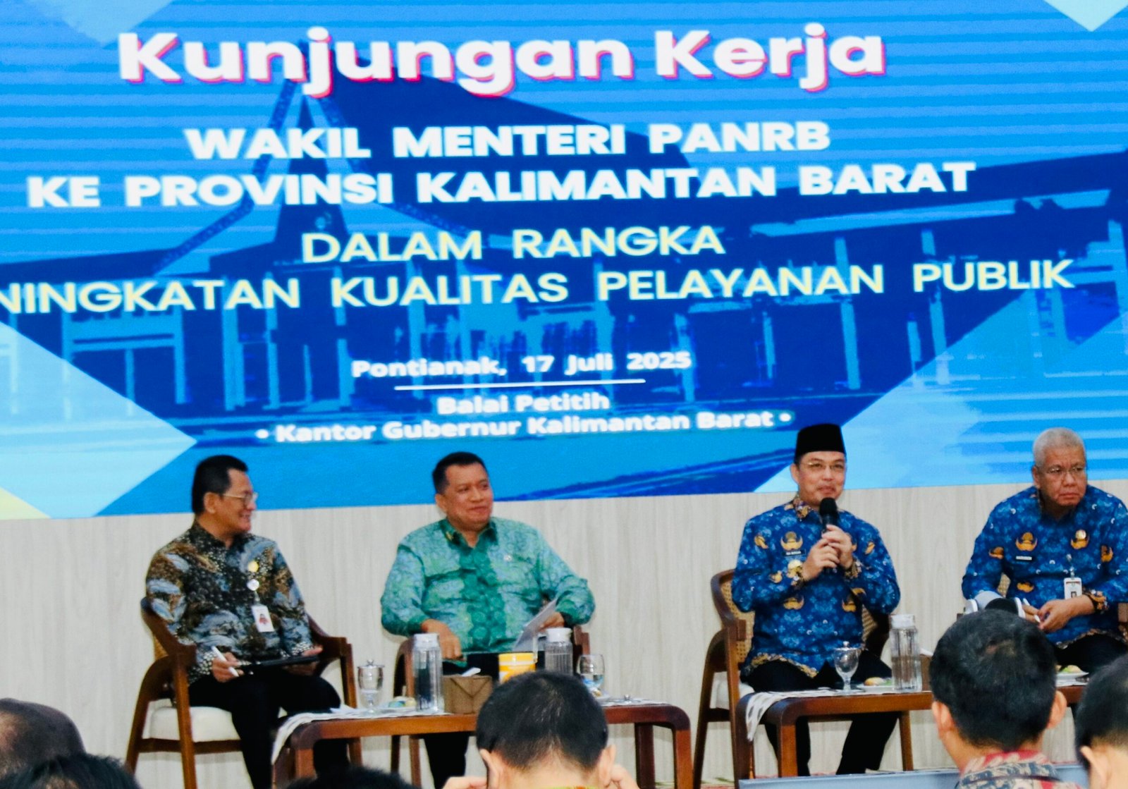 PONTIANAK – Pemerintah Provinsi Kalimantan Barat menegaskan komitmennya dalam meningkatkan kualitas pelayanan publik. Hal ini disampaikan Gubernur Kalbar, Ria Norsan, saat menerima kunjungan Wakil Menteri Pendayagunaan Aparatur Negara dan Reformasi Birokrasi (WamenPAN-RB), Komjen Pol (Purn) Purwadi Arianto di Balai Petitih Kantor Gubernur Kalbar, Kamis (17/7/2025).