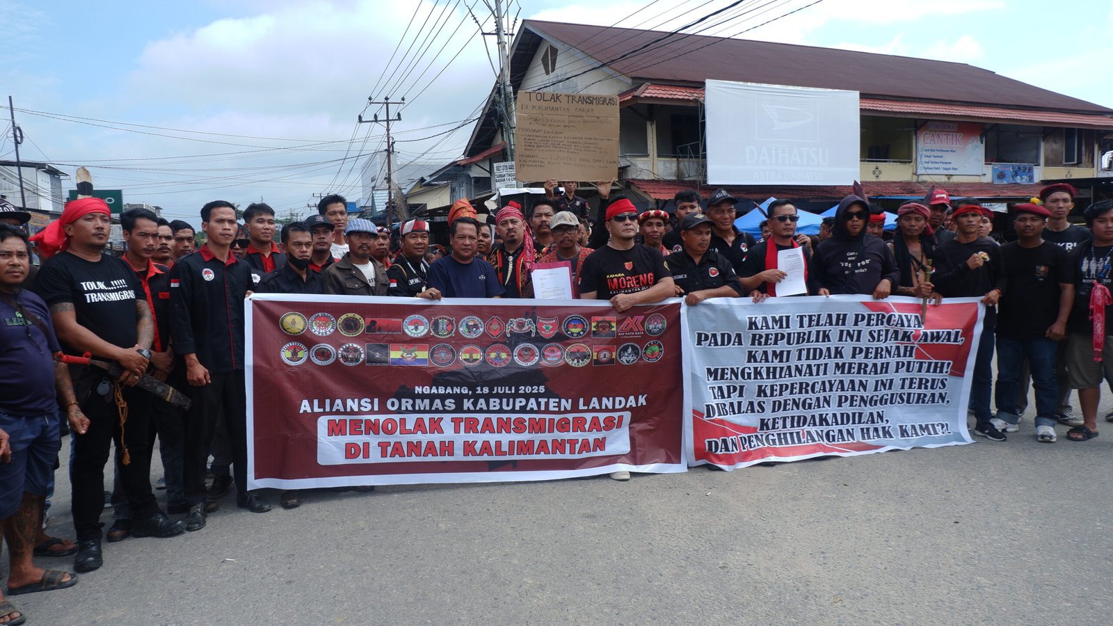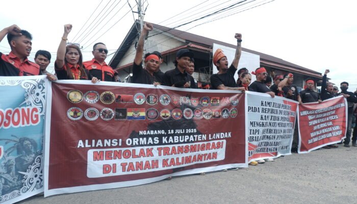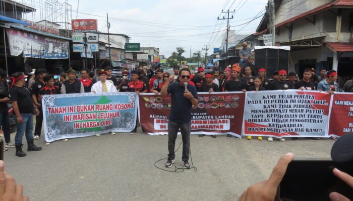 LANDAK – Aliansi organisasi masyarakat yang terdiri dari 28 ormas melakukan aksi demonstrasi menolak program transmigrasi ke wilayah Kalimantan, termasuk ke Kalimantan Barat, yang dilaksanakan di simpang tiga Dusun Pulau Bendu, Desa Hilir Tengah, Kecamatan Ngabang, Kabupaten Landak. Jumat, 18 Juli 2025.