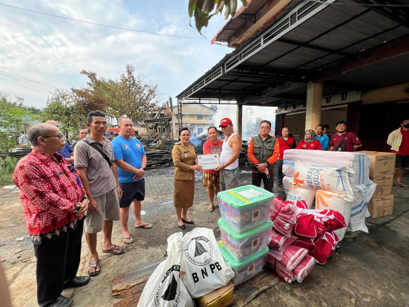 LANDAK – Bupati Landak meninjau sekaligus menyerahkan sejumlah bantuan kepada korban bencana kebakaran yang menghanguskan empat ruko yang berada di Jalan Serimbu-Ngabang depan perumahan dinas Batalyon Armed 16/Tumbak Kaputing, Desa Hilir Tengah, Kecamatan Ngabang, Jumat (18/07/25).