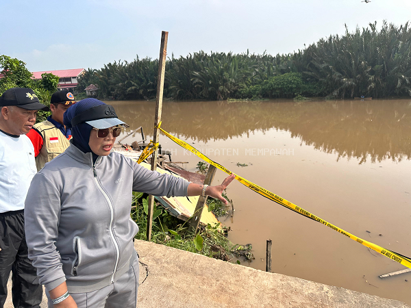 MEMPAWAH — Bupati Mempawah, Erlina, meninjau langsung lokasi rumah warga yang ambruk dan hanyut ke sungai akibat erosi di RT 001 RW 001, Dusun Makmur, Desa Antibar, Kecamatan Mempawah Timur, Minggu (27/7/2025).