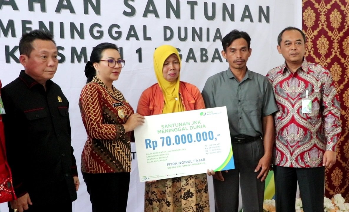 LANDAK – Bupati Landak, Karolin Margret Natasa, disaksikan Direktur Human Capital dan Umum BPJS Ketenagakerjaan, Abdur Rahman Irsyadi, menyerahkan santunan dari BPJS Ketenagakerjaan kepada ahli waris salah seorang siswa SMKN 01 Ngabang, yang meninggal dunia saat menjalankan program magang atau Praktik Kerja Lapangan (PKL), di Aula Kecil Kantor Bupati Landak. Jumat, 22 Agustus 2025.