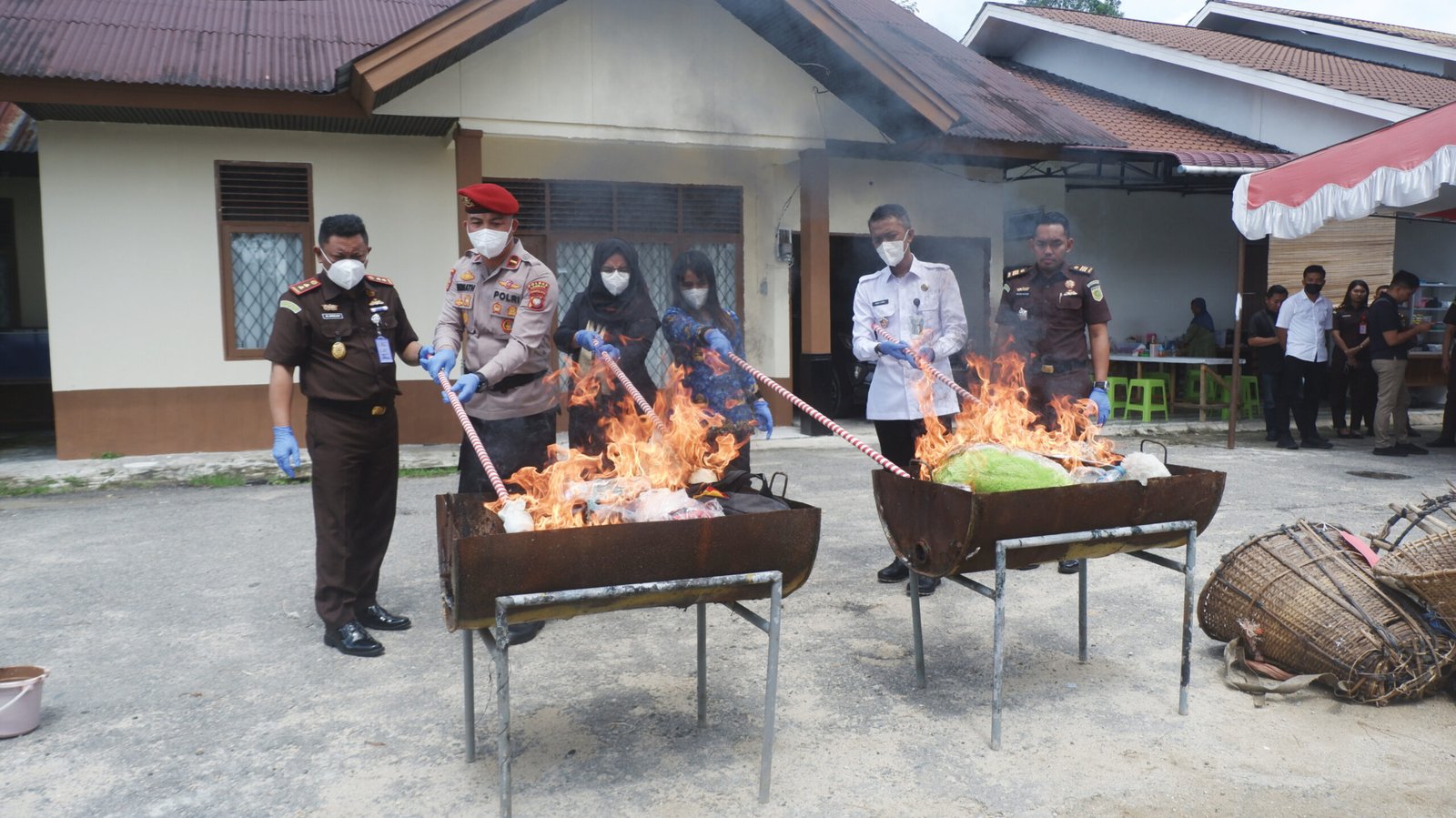 Dalam pemusnahan ini, barang bukti narkotika dimusnahkan dengan cara diblender dan dicampur cairan pembersih lantai sebelum dibuang, sementara barang bukti kasus pencurian berupa mata dodos, tombak TBS sawit maupun senjata tajam dari bahan besi dipotong.