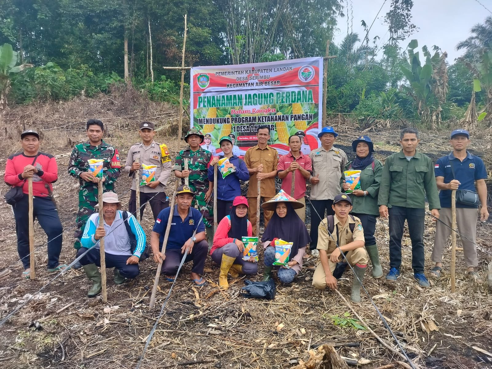 LANDAK – Komando Rayon Militer (Koramil) 07/Air Besar turut berpartisipasi dalam penanaman jagung di lahan pertanian Dusun Saham, Desa Serimbu, Kecamatan Air Besar, Kabupaten Landak Senin, (20/10/2025).