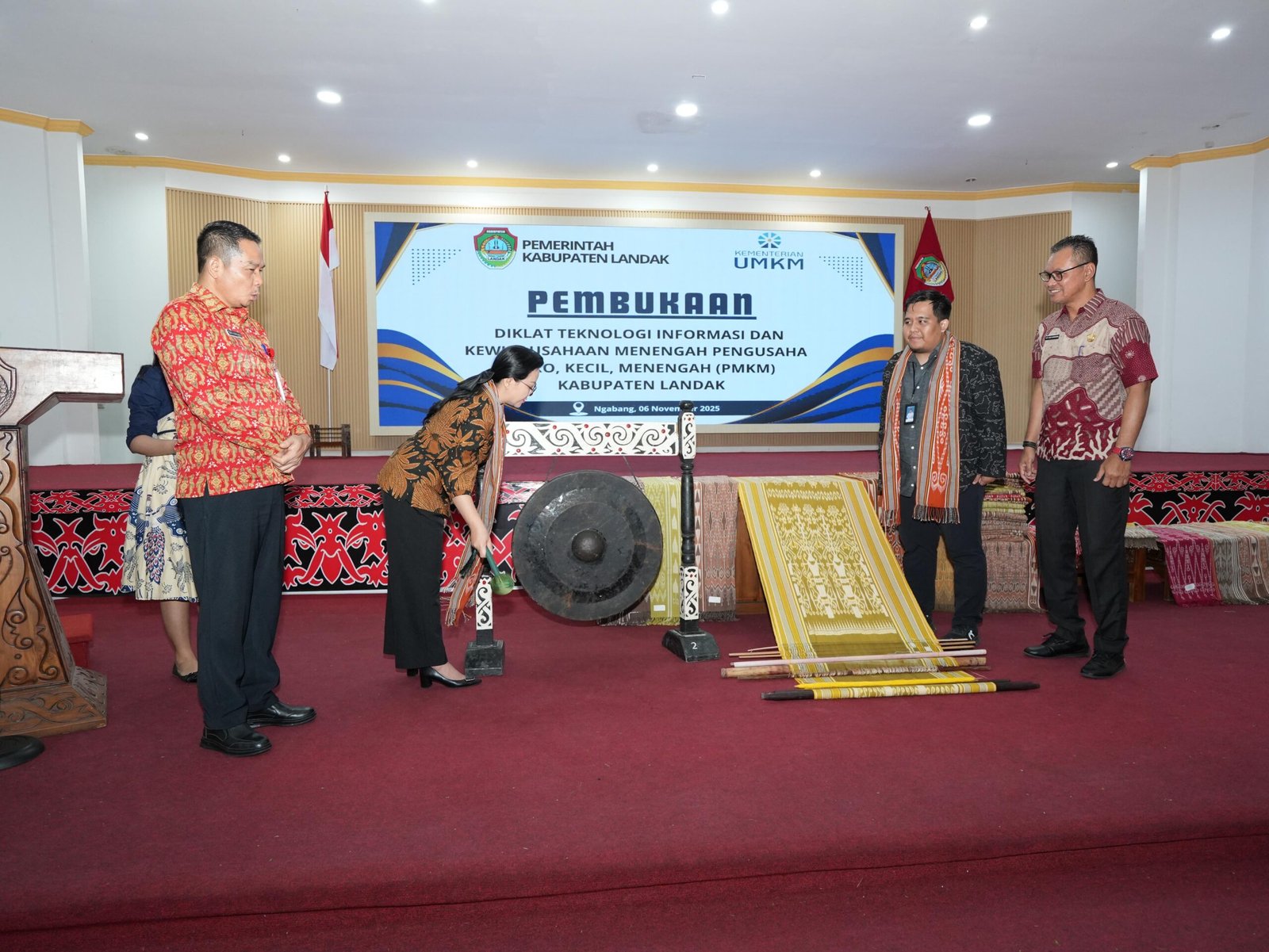 LANDAK – Bupati Landak Karolin Margret Natasa membuka secara resmi diklat teknologi informasi dan kewirausahaan menengah Pengusaha Mikro, Kecil, Menengah (PMKM) Kabupaten Landak, bertempat di Aula Besar Kantor Bupati Landak, Kamis (06/11/2025), malam.