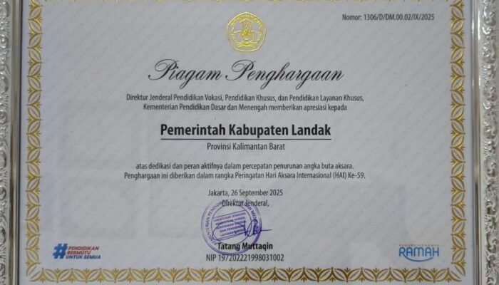 LANDAK – Pemerintah Kabupaten Landak menerima Piagam Penghargaan atas keberhasilan penurunan angka buta aksara di Wilayah Kabupaten Landak dalam acara Gebyar Pendidikan Non-Formal dan Informal (PNFI) serta Peringatan Hari Aksara Internasional tahun 2025 di Jakarta, 26 September lalu.