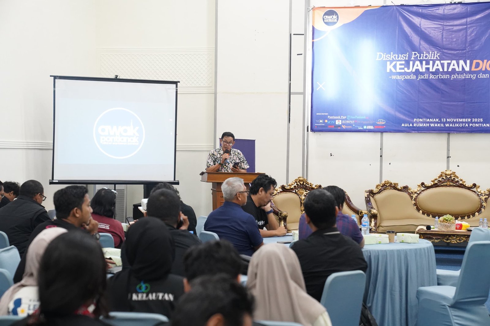 “Kemajuan teknologi memang membawa banyak kemudahan. Namun di balik itu juga muncul tantangan dan ancaman baru yang harus kita hadapi bersama,” ujar Suryadin dalam sambutannya dalam Diskusi Publik Waspada Kejahatan Digital yang diinisiasi Aliansi Wartawan Kriminal (Awak) Pontianak, Kamis 13 November 2025 di Aula Rumah Dinas Wakil Wali Kota Pontianak.