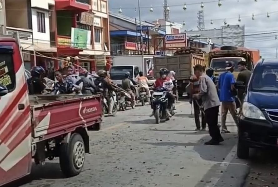 Aksaraloka com, SAMBAS – Arus lalu lintas di Jalan Raya Pasar Tebas sempat terganggu setelah sejumlah buah sawit jatuh dan berserakan di badan jalan, Rabu (3/12/2025).