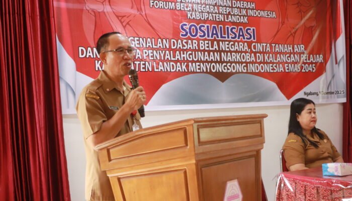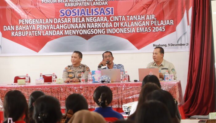 LANDAK – Dewan Pimpinan Daerah (DPD) Forum Bela Negara Republik Indonesia Kabupaten Landak, memberikan sosialisasi tentang pengenalan dasar bela negara, cinta tanah air dan bahaya penyalahgunaan narkotika di kalangan pelajar Kabupaten Landak menyongsong Indonesia Emas  2045, di SMK N 1 Ngabang, Kabupaten Landak. Selasa, 9 Desember 2025.