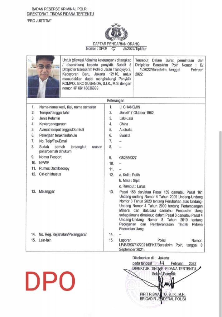 Melansir surat DPO yang dikeluarkan Bareskrim Polri 14 Febuari 2022, disebutkan bahwasanya WNA asal China nama Li Changjin yang berdomisili di Australia, diduga melakukan tindak pidana di Indonesia dan terjerat pasal berlapis.