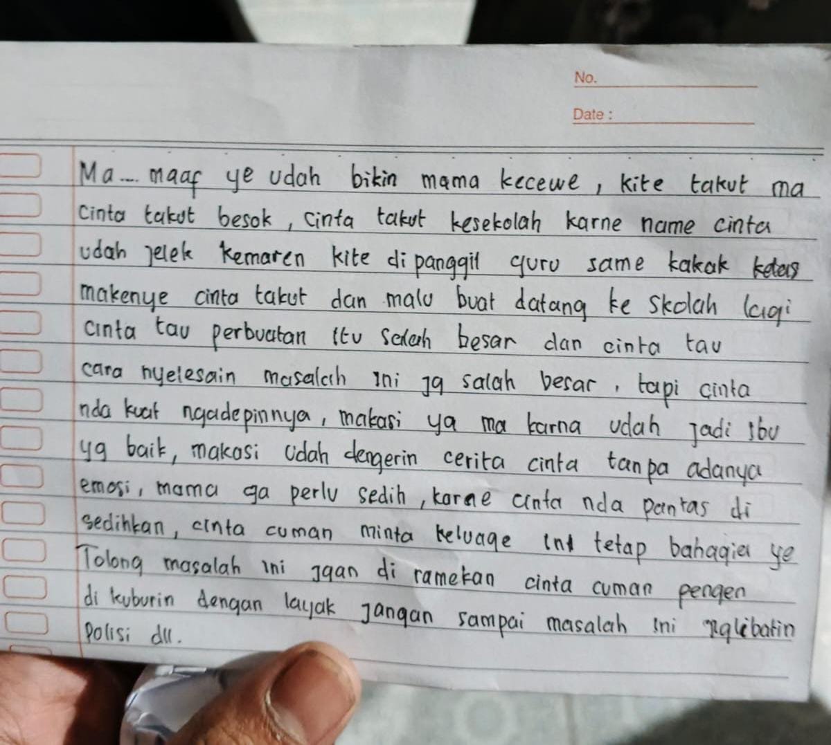 “Isi surat tersebut menyatakan korban merasa malu untuk kembali ke sekolah, meminta maaf kepada keluarga, serta berpesan agar dimakamkan dengan layak,” kata Ari.