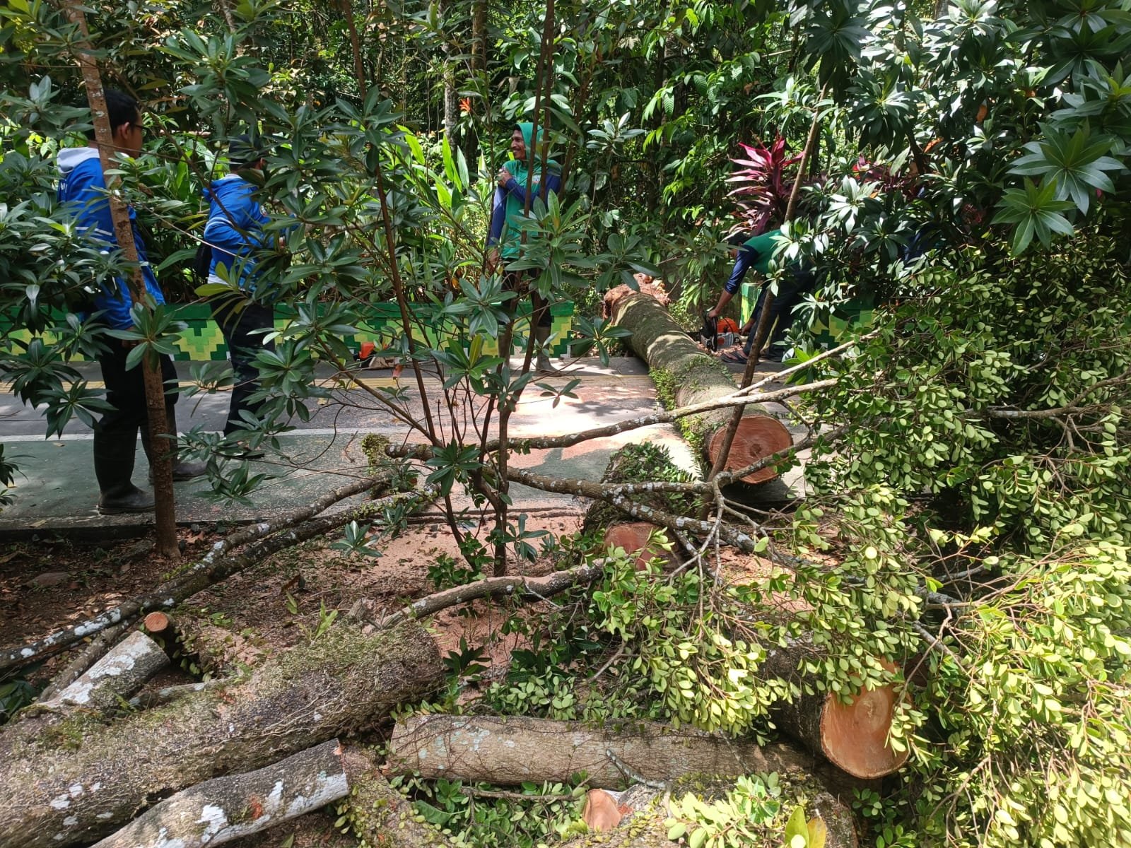 Sekitar pukul 11.15 WIB, petugas Dinas PU Kota Pontianak melakukan pemotongan dan pembersihan batang serta ranting pohon.