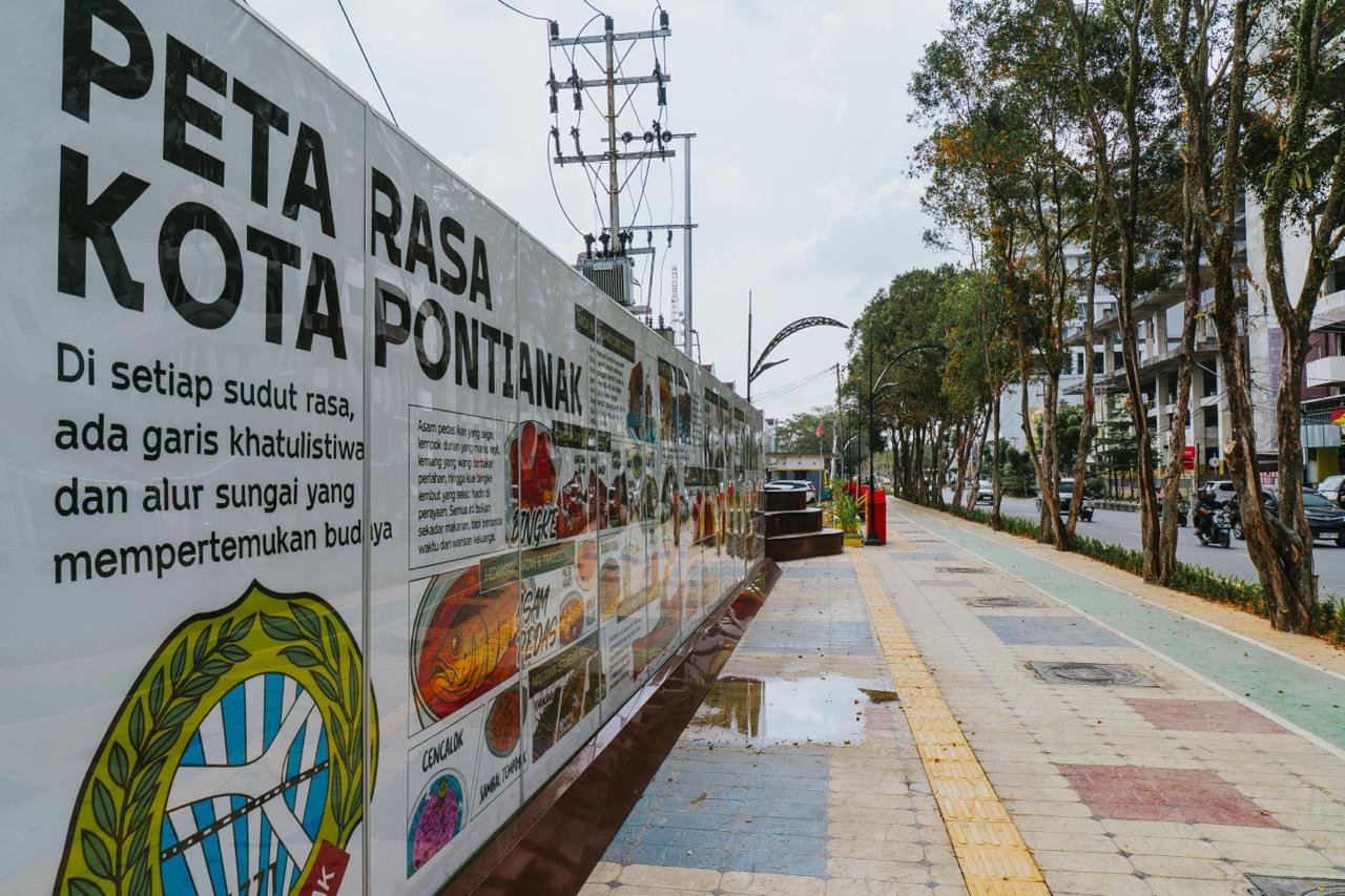 PONTIANAK – Bagi warga Pontianak, trotoar bukan sekadar jalur lalu-lalang. Ia adalah ruang bertemu, tempat melangkah pelan, dan kini juga ruang bercerita. Pemerintah Kota Pontianak mulai menata trotoar di sepanjang Jalan MT Haryono dengan sentuhan visual Peta Rasa Kota Pontianak—sebuah upaya menghadirkan identitas kuliner khas Kota Khatulistiwa ke ruang publik.