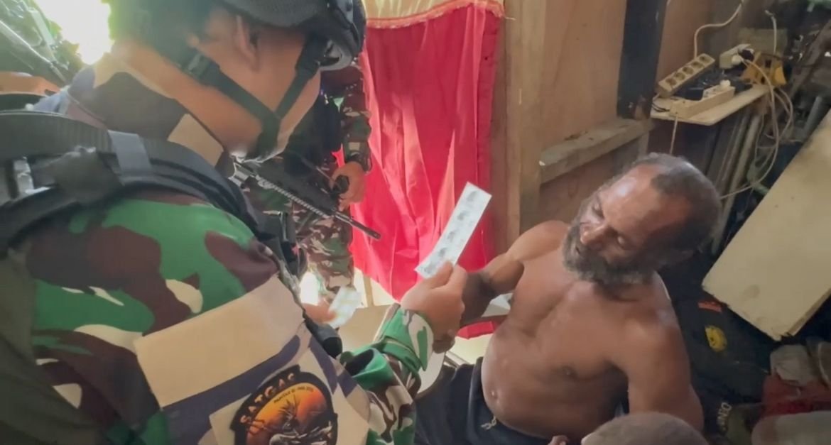 Salah satu momen hangat terlihat ketika seorang prajurit memberikan penjelasan detail mengenai dosis dan cara meminum obat kepada seorang warga lanjut usia.