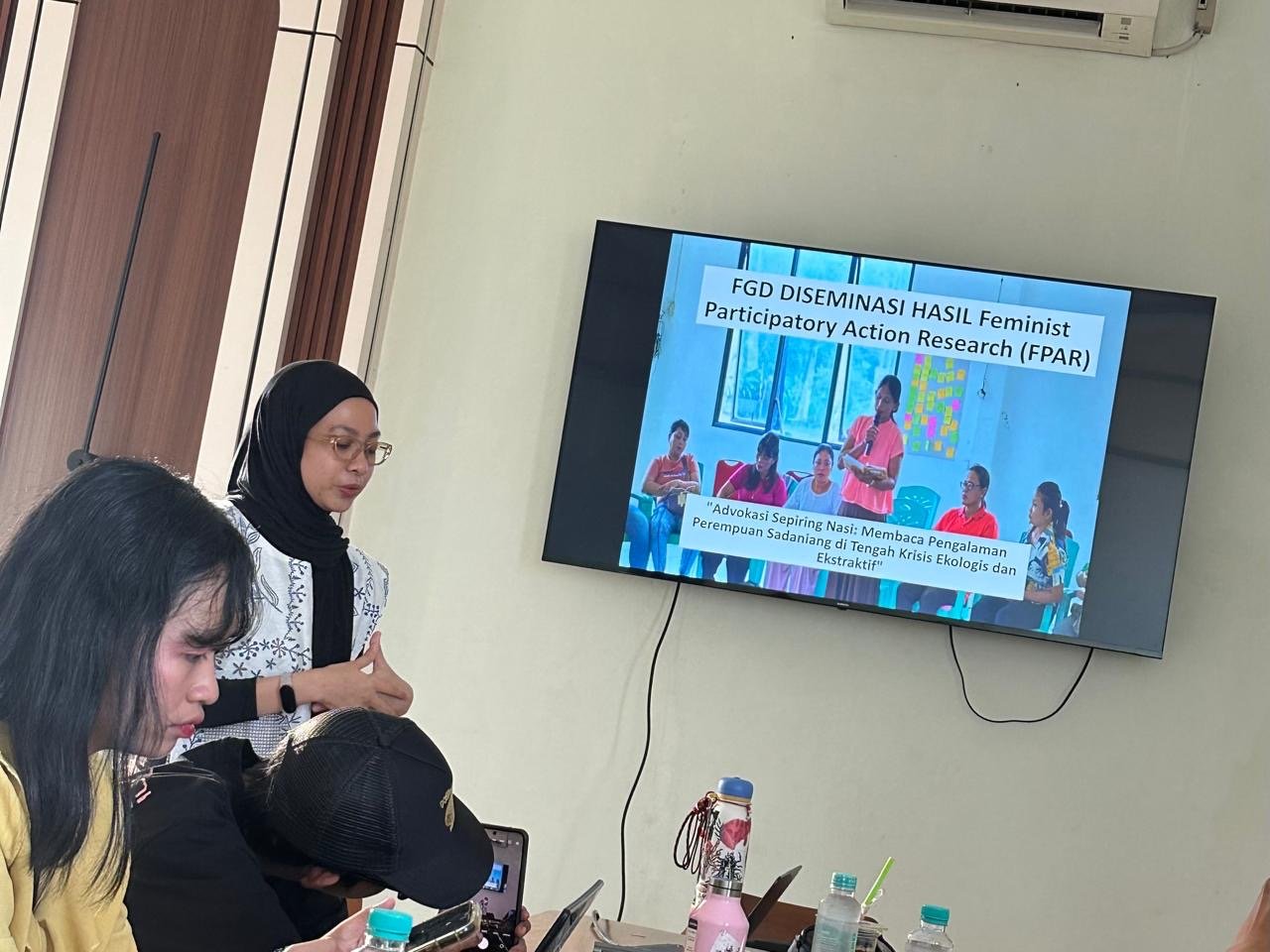 Diskusi bertajuk “Advokasi Sepiring Nasi: Membaca Pengalaman Perempuan Sadaniang di Tengah Krisis Ekologis dan Ekstraktif” tersebut membahas hasil riset Feminist Participatory Action Research (FPAR) yang dilakukan di Kecamatan Sadaniang, Kabupaten Mempawah.