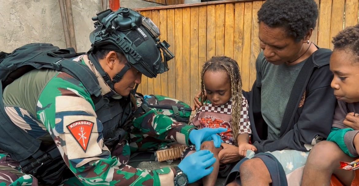 Dalam salah satu momen yang terekam, seorang prajurit medis Satgas Yon Parako 466 terlihat berlutut dengan penuh ketelatenan membersihkan serta mengobati luka di lutut seorang anak kecil.