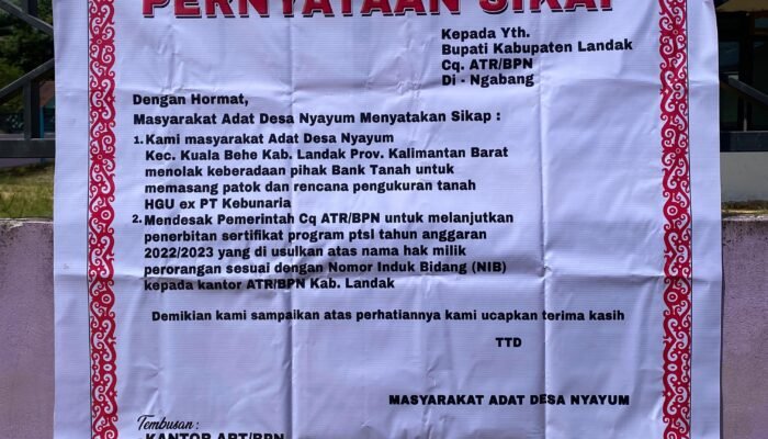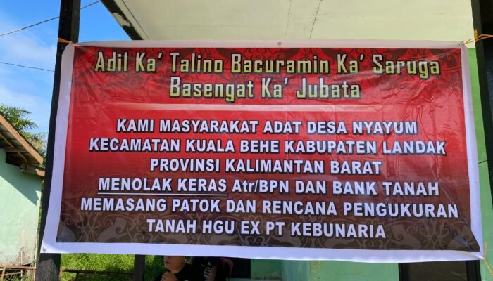 LANDAK – Masyarakat adat Desa Nyayum, Kecamatan Kuala Behe, Kabupaten Landak, Kalimantan Barat, menggelar ritual adat sebagai bentuk penolakan terhadap pemasangan patok dan pengukuran lahan oleh ATR/BPN bersama Bank Tanah, Rabu (8/4/2026).