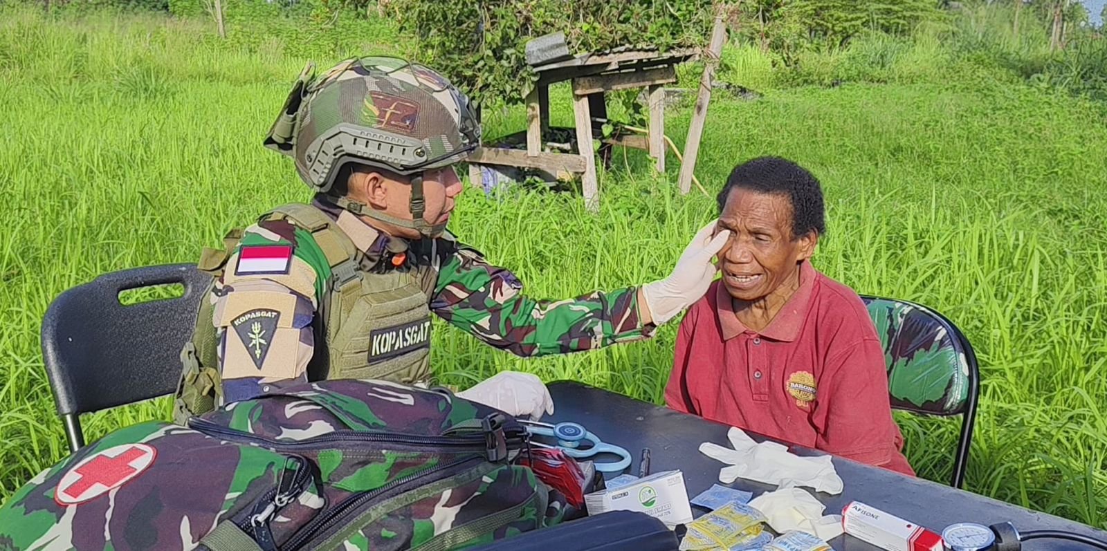 Dengan memanfaatkan meja lipat dan perlengkapan medis darurat, prajurit medis Korps Pasukan Gerak Cepat (Korpasgat) memberikan pelayanan kesehatan dengan penuh dedikasi.