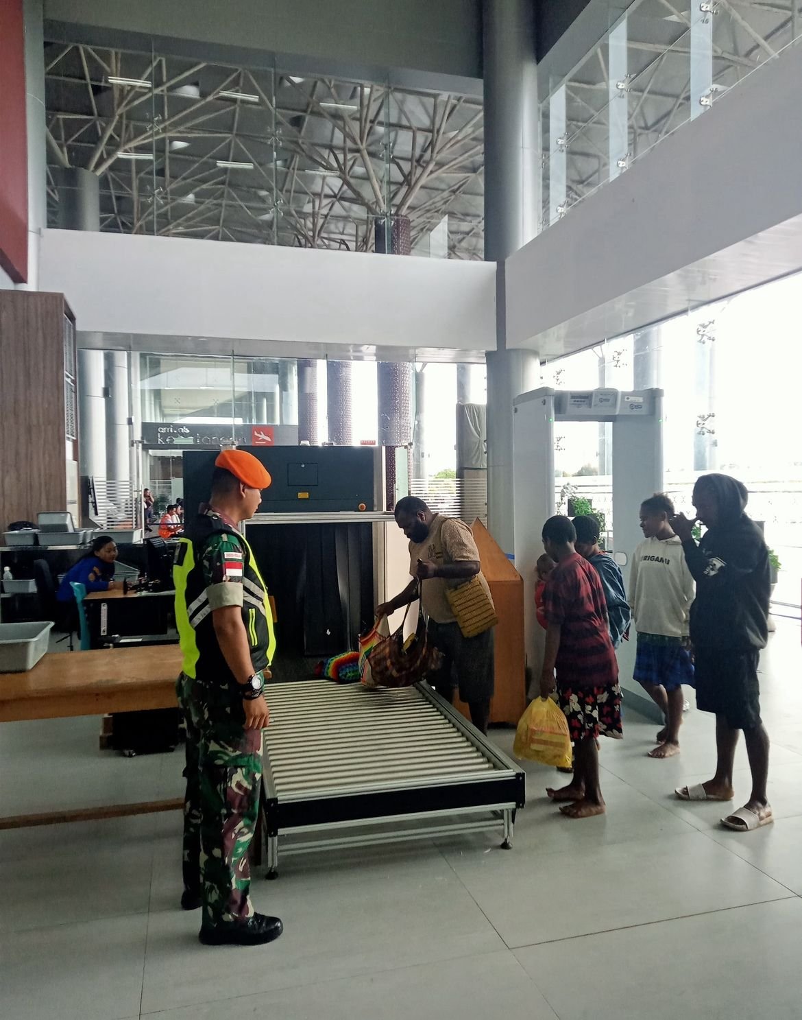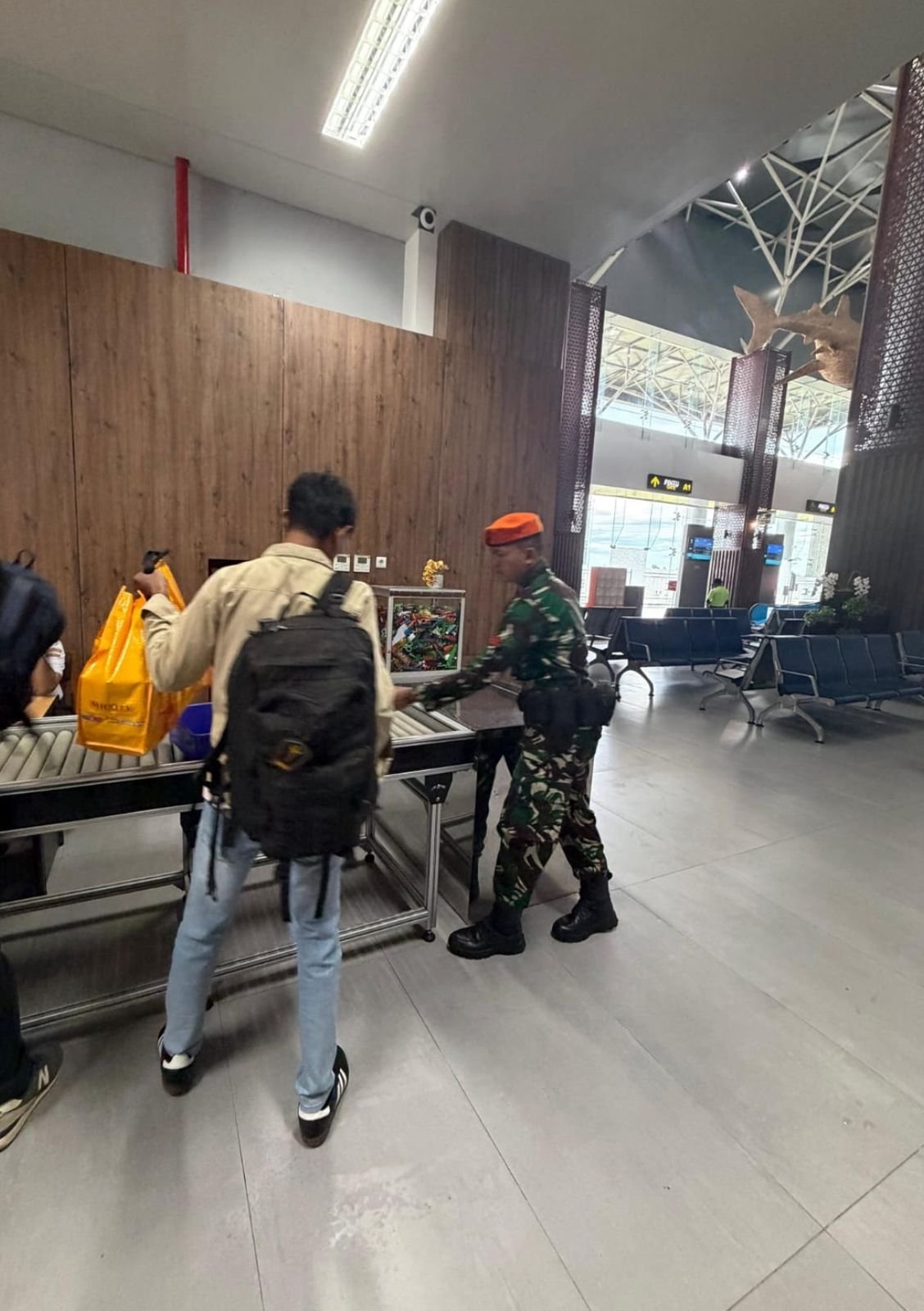 Dengan sigap dan ramah, prajurit membantu para penumpang, termasuk masyarakat lokal yang hendak bepergian, untuk meletakkan barang bawaan ke atas conveyor belt.