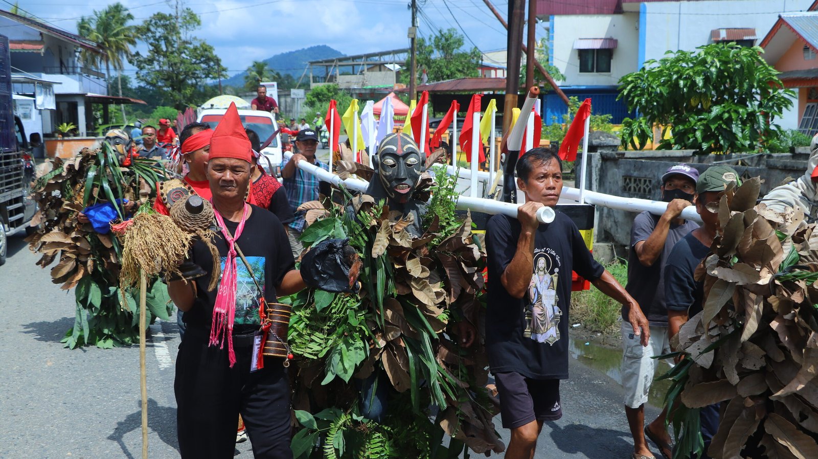 Pada barisan depan, kelompok topeng atau Nopeng khas Dayak dengan tubuh yang dihias dedaunan memimpin barisan, yang kemudian diikuti rombongan pemikul tandu berisi benih-benih padi maupun hasil pertanian yang akan didoakan di panyugu, termasuk paraga adat yang dibawa oleh Panyangahatn.